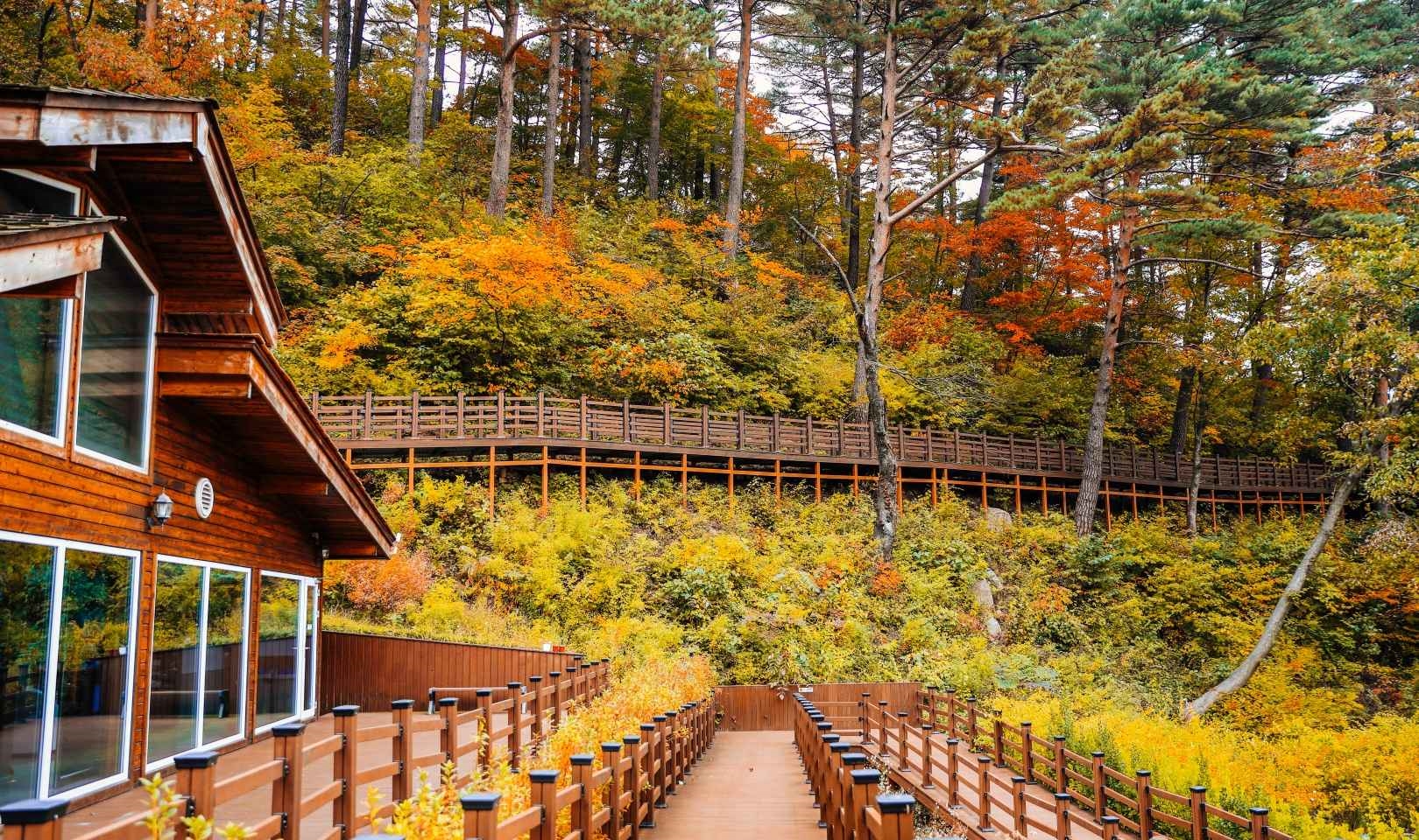 가을이 되면 국립대관령치유의숲은 붉은 단풍과 금빛 소나무가 어우러진 환상적인 풍경으로 변신해요.