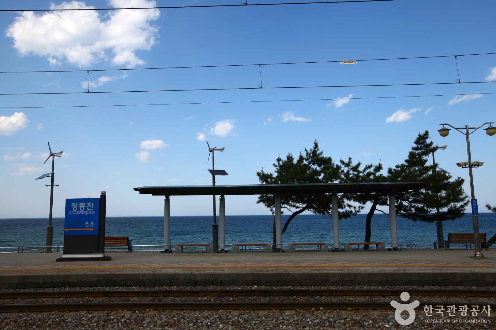 정동진역 철길 앞: 바다와 가장 가까운 기차역 앞에서 일출 배경으로 한 장!
