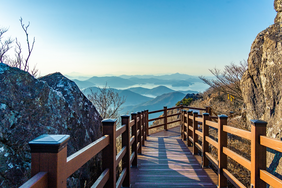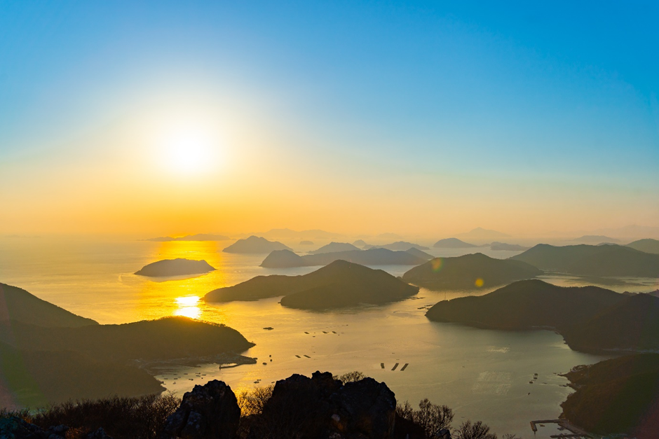 케이블카를 타고 정상에 도착하면, 노자산 정상의 상부 전망대에서 다도해의 절경이 펼쳐집니다. 날씨가 맑은 날엔 통영, 남해, 심지어 일본 쓰시마섬까지 조망 가능할 정도로 시야가 탁 트여 있어요!