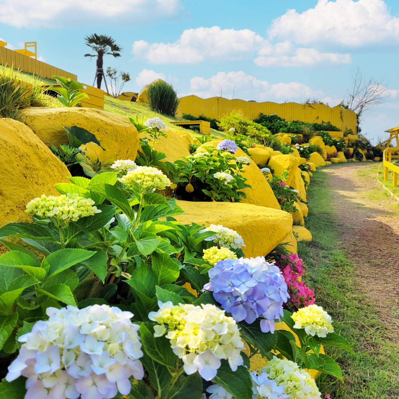 봄과 초여름 사이, 노랑버덩은 수국 명소로 변신합니다! 다양한 색감의 수국들이 노란 정원과 어우러져 이국적인 분위기를 자아내며 많은 사람들의 카메라 셔터를 부르게 해요.
