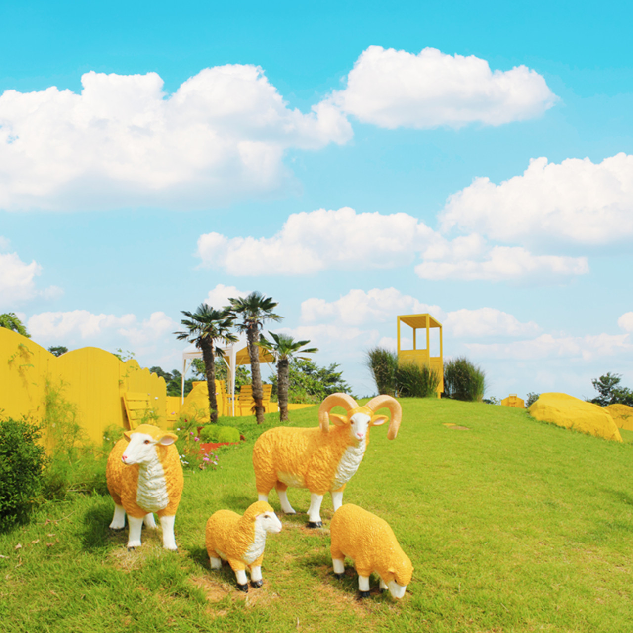 입구에서부터 펼쳐지는 노란색 울타리와 의자, 돌, 장식물들은 마치 동화 속으로 들어온 듯한 착각을 불러일으켜요. 인위적이지 않은 자연스러움 속에서도 색의 통일감과 정성이 느껴져, 보는 이의 마음을 환하게 밝혀주는 매력이 가득하답니다.
