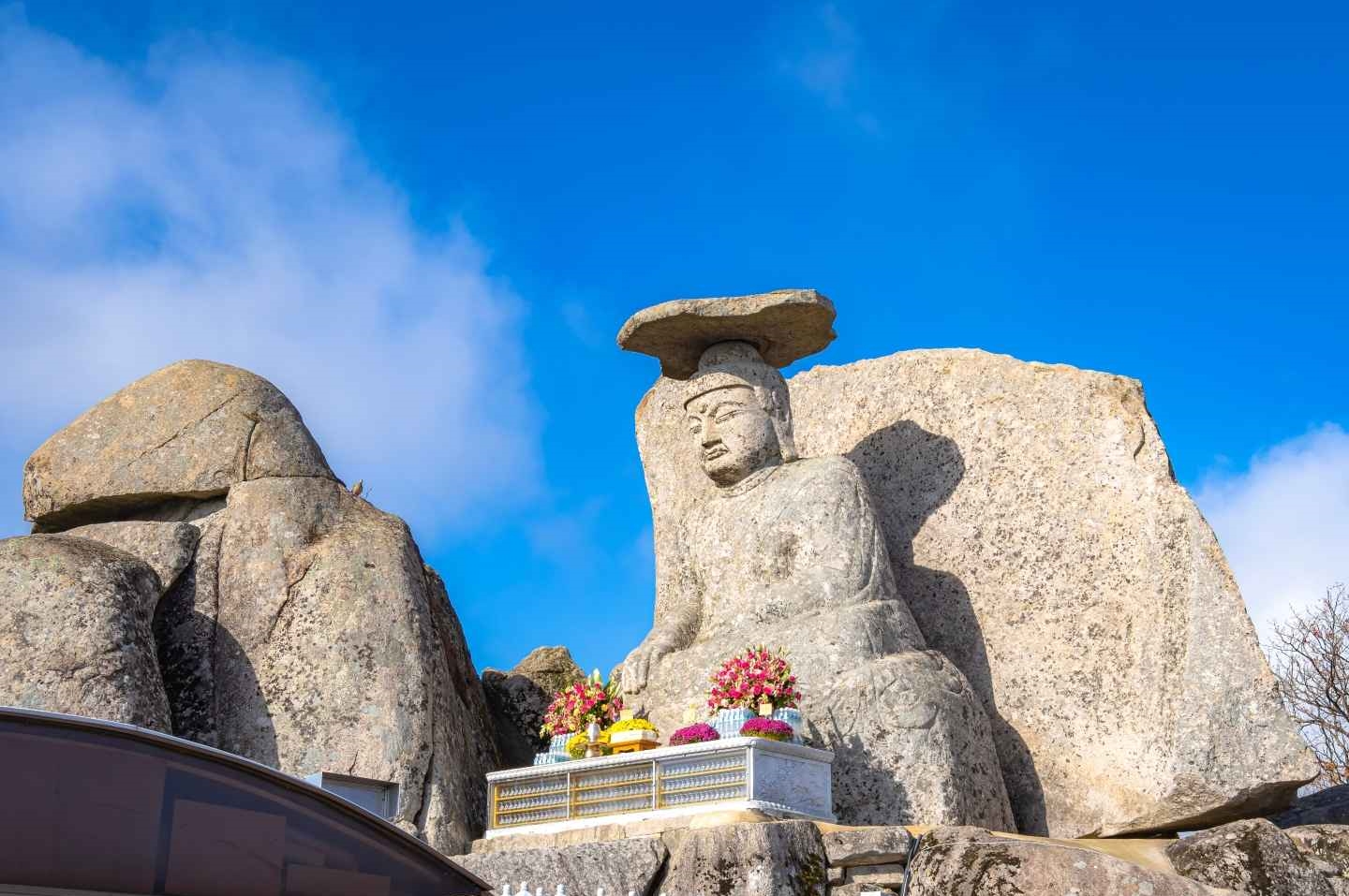 갓바위 정상에는 국보급 불상이라 불릴 정도로 위엄 있는 관봉석조여래좌상이 자리 잡고 있어요. 높이 4m가 넘는 이 불상은 통일신라의 섬세한 조각 기술이 돋보이며, 정성껏 기도하면 꼭 소원을 하나 들어준다는 믿음으로 유명하죠.