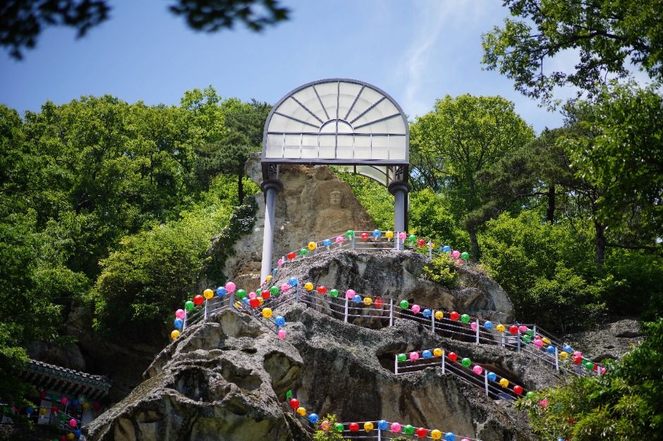 암벽의 가장 높은 곳에 새겨진 마애여래좌상은 높이 4m, 폭 2.2m에 달하는 불상으로, 보물로 지정되어 있습니다. 오랜 풍화 작용으로 훼손이 심해 현재는 보호를 위해 유리 지붕을 씌워 놓았습니다. 이 마애불상으로 오르는 길은 바위에 파놓은 가파른 계단과 자연 동굴을 지나게 되어 있어 경건함과 짜릿함을 동시에 느낄 수 있습니다.
