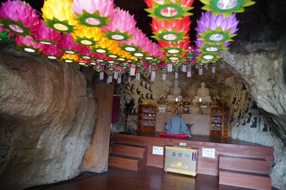 수십 미터 높이의 암벽에는 총 12개의 석굴이 파여 있습니다. 이 굴들은 서너 명이 들어갈 수 있는 크기부터 작은 크기까지 다양하며, 각 굴마다 동자승부터 노스님까지 다양한 불상이 모셔져 있습니다. 특히, 법당 역할을 하는 법당굴은 외부 벽은 집처럼 되어 있지만 안으로 들어가면 천장과 벽이 모두 돌로 된 진정한 석굴의 모습을 하고 있습니다.