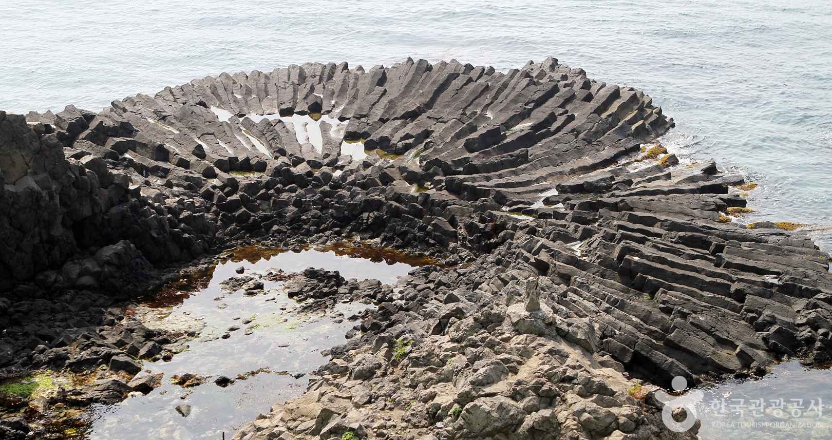 대표적으로는 수직으로 솟은 주상절리뿐 아니라 기울어진 주상절리, 누워있는 주상절리, 그리고 이곳의 하이라이트인 부채꼴 주상절리가 있는데요, 이 부채 모양의 절리는 세계적으로도 유례를 찾기 힘든 희귀한 형태랍니다.