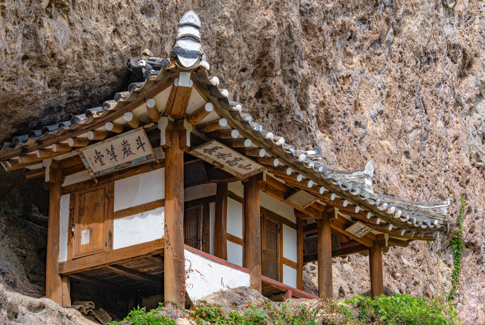 전라북도 고창군 아산면 영모정 마을의 뒷산에 자리한 두암초당. 한옥 정자가 병바위 절벽 아래 중턱에 지어져 있어 보는 순간 감탄을 자아내는 풍경이 펼쳐집니다. ‘소반바위’로 불리는 깎아지른 절벽 위에 정자가 세워져 있어 “어떻게 이런 곳에 집을 지었지?” 하는 생각이 들 정도예요.