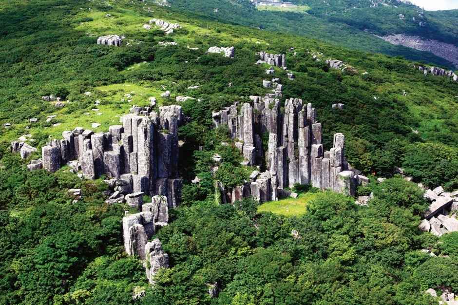 그중에서도 입석대는 가장 오래된 형성 지질로 알려져 있으며, 높이 약 20m, 폭 120m에 달하는 40여 개의 돌기둥들이 육각형 또는 다각형의 단면을 가진 정교한 형태로 발달되어 있어요. 이처럼 규칙적으로 갈라진 암석 구조는 절리라 불리며, 암석이 냉각되는 과정에서 생기는 자연의 기하학적 예술이에요.