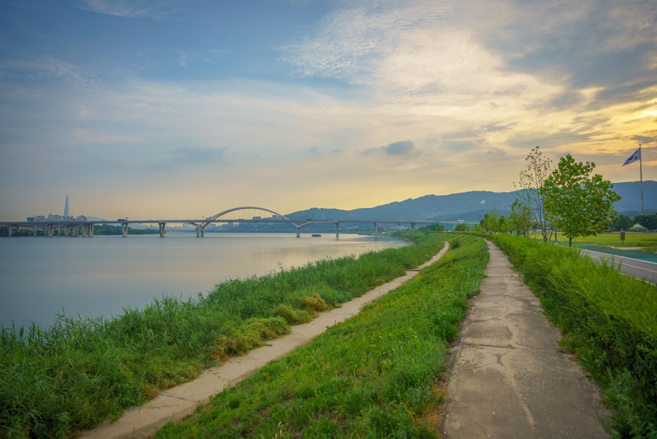 - 여름 – 초록 잔디와 한강 풍경) 푸른 잔디와 한강 풍경이 어우러져 피크닉과 산책을 즐기기 좋습니다.