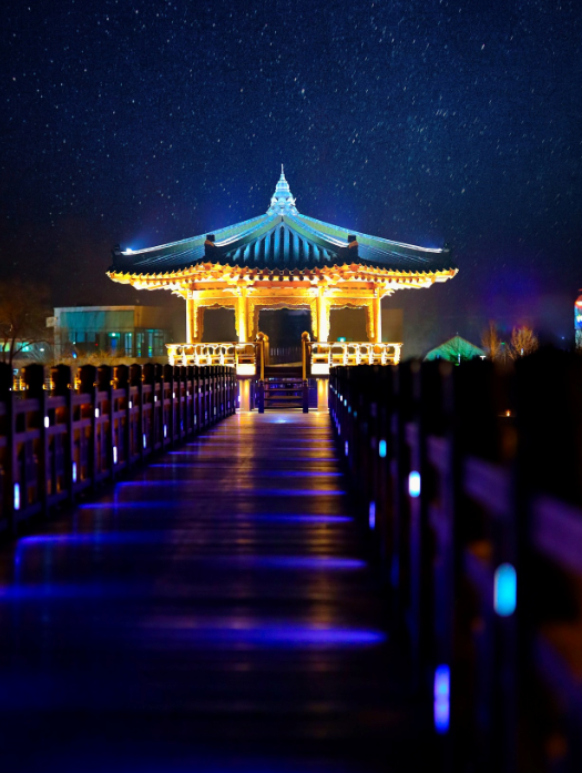 월영교는 한국에서 가장 긴 목조 다리로, 밤이 되면 다리 전체가 조명으로 밝혀져 환상적인 야경을 제공합니다. 특히 다리 아래 물에 반사된 불빛은 마치 그림 같은 풍경을 만들어냅니다.