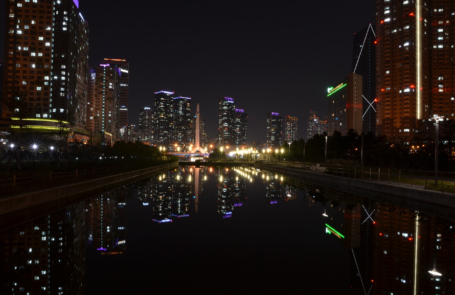 송도 센트럴파크는 도시 속에서 자연과 야경을 함께 즐길 수 있는 특별한 장소입니다. 공원 중앙을 가로지르는 수로에 반사되는 고층 빌딩의 조명은 송도의 현대적인 매력을 더해줍니다.