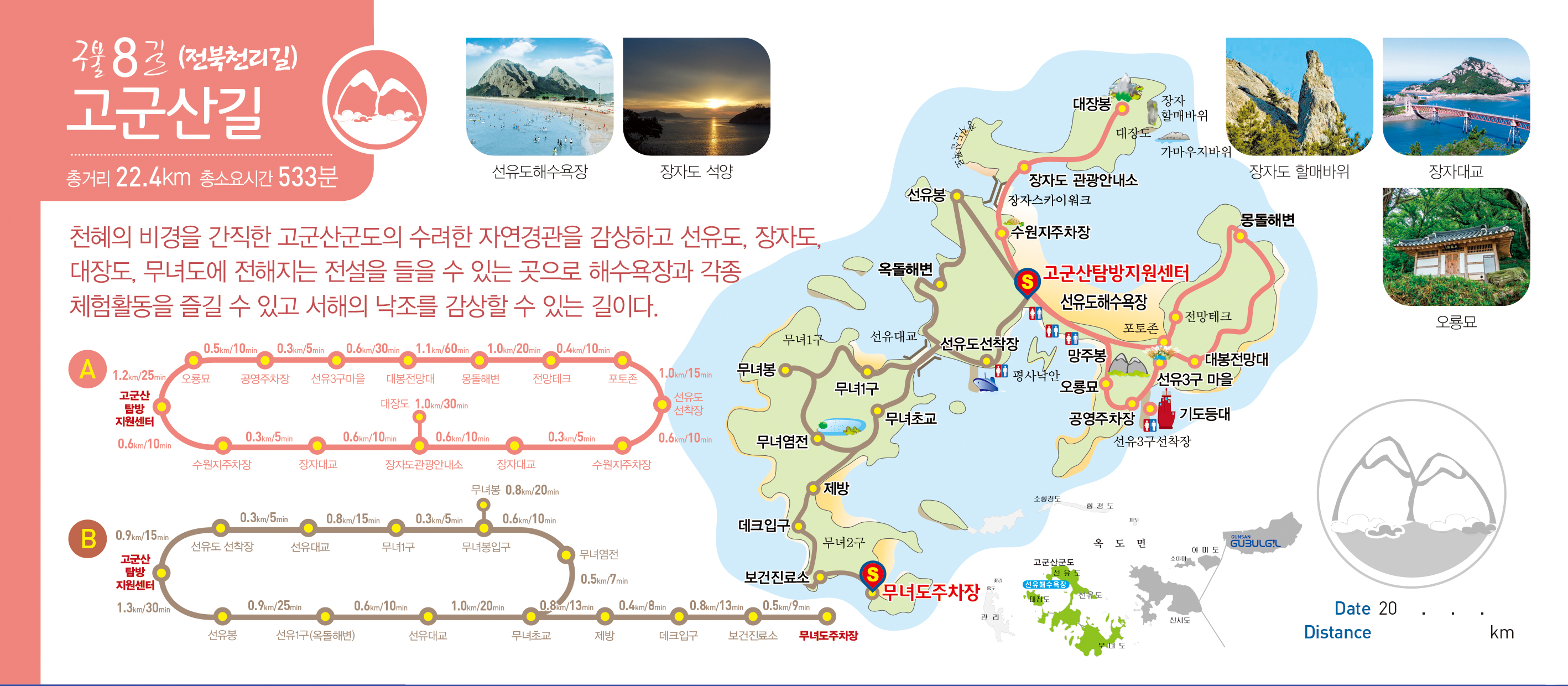 | 2코스 | 선유1구 → 선유봉 → 장자도 → 대장도 | 고군산군도의 아름다운 섬 풍경 감상 |