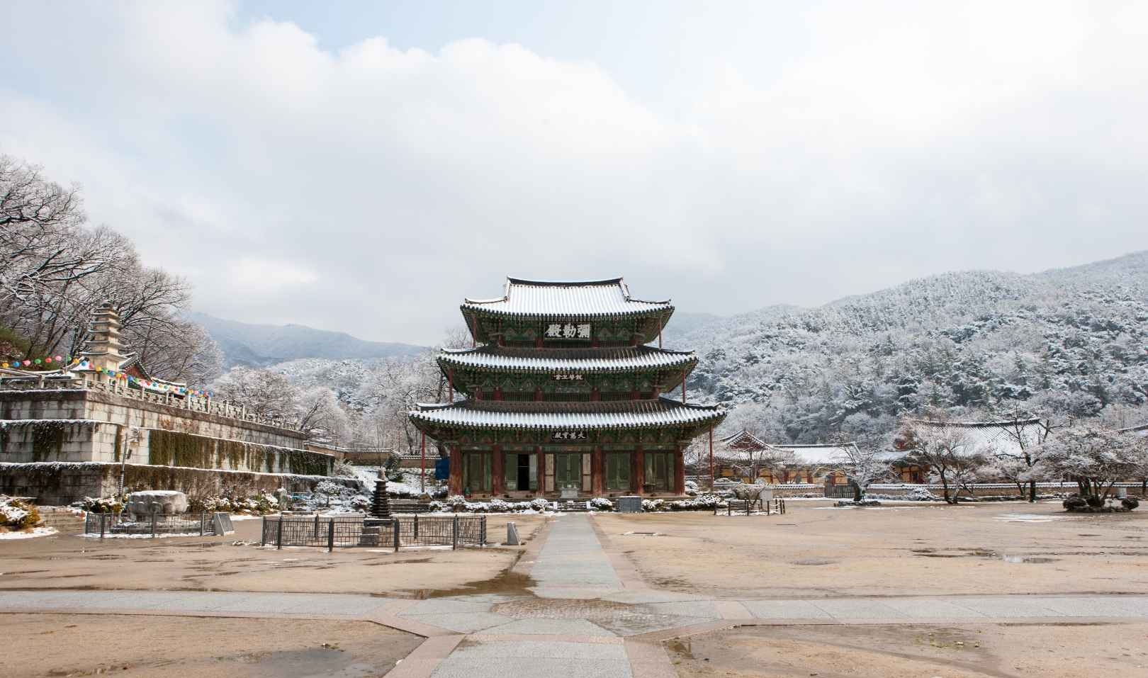 ✅ 미륵전 앞 광장: 삼층지붕과 흰 눈의 조화가 환상적이에요.
