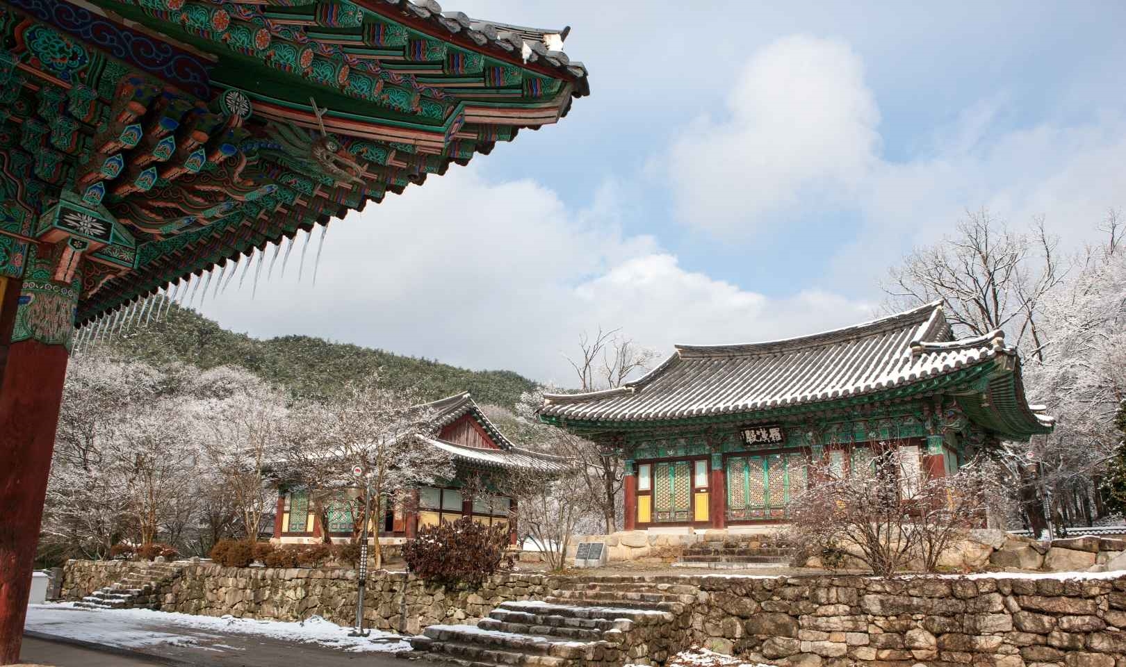 겨울이 오면 금산사는 흰 눈으로 덮인 고요한 산사로 변합니다. 고찰 특유의 단아한 곡선 지붕 위로 소복이 내린 눈, 그리고 고목 사이로 흩날리는 눈발은 마치 한 폭의 수묵화 같죠. 경내를 걷다 보면 바스락거리는 눈 소리마저도 마음을 정화해주는 치유의 배경음처럼 들린답니다. 특히 미륵전 앞 넓은 마당은 눈이 쌓이면 탁 트인 전경이 아름답고, 멀리 모악산 능선 너머로 비치는 햇살이 황금빛 눈세상을 만들어내요.