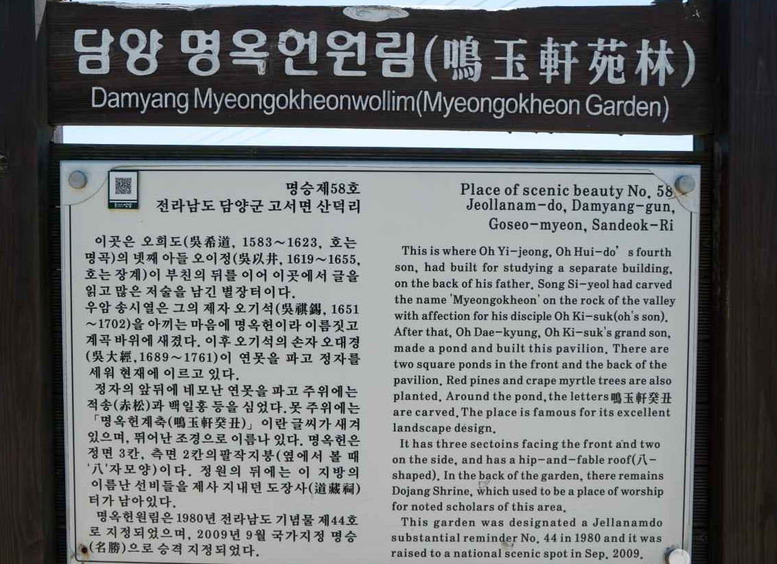‘명옥헌’이라는 이름은 계곡을 따라 흐르는 맑은 물소리가 마치 옥구슬이 부딪히는 소리 같다고 하여 붙여진 이름인데요, 그만큼 자연 그대로의 아름다움을 간직한 장소랍니다. 오늘날에는 문화재청이 지정한 ‘명승’ 제66호로 보호되고 있어요.