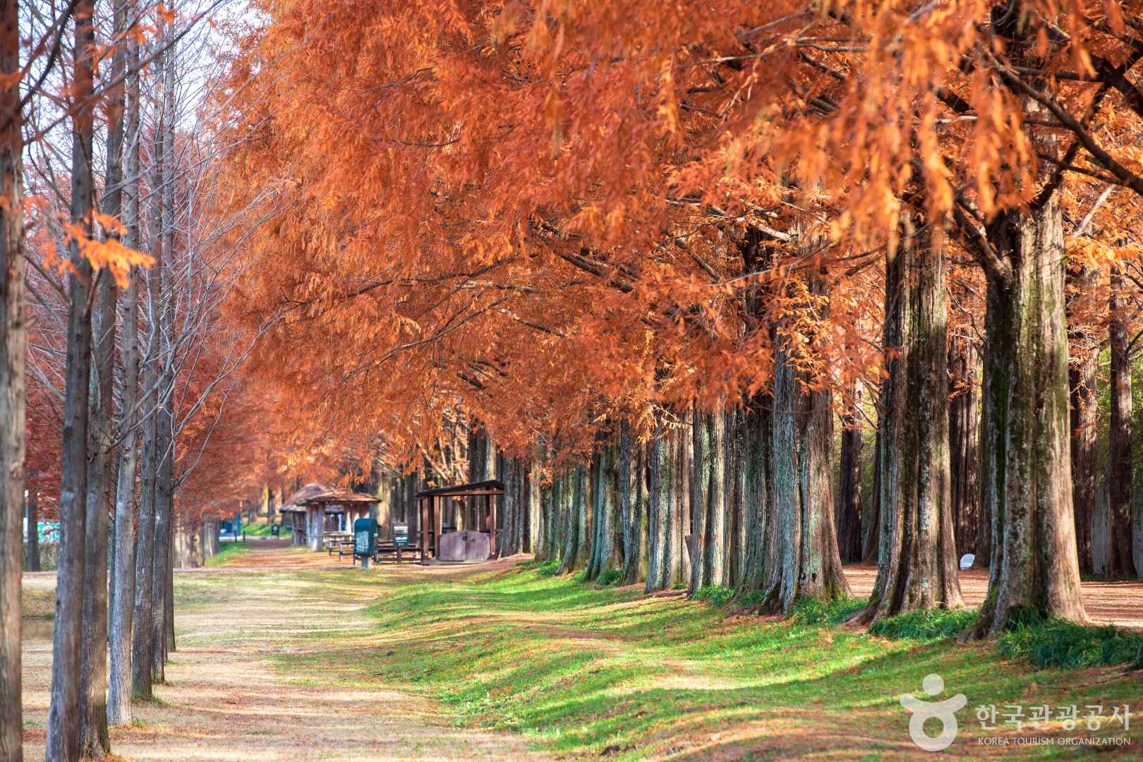가을이 오면 메타세쿼이아 나무들이 붉은빛, 주황빛으로 물들며 마치 영화 속 배경처럼 환상적인 장면을 연출해요. 낙엽이 뚝뚝 떨어지는 길을 걷는 기분, 상상만으로도 설레죠?