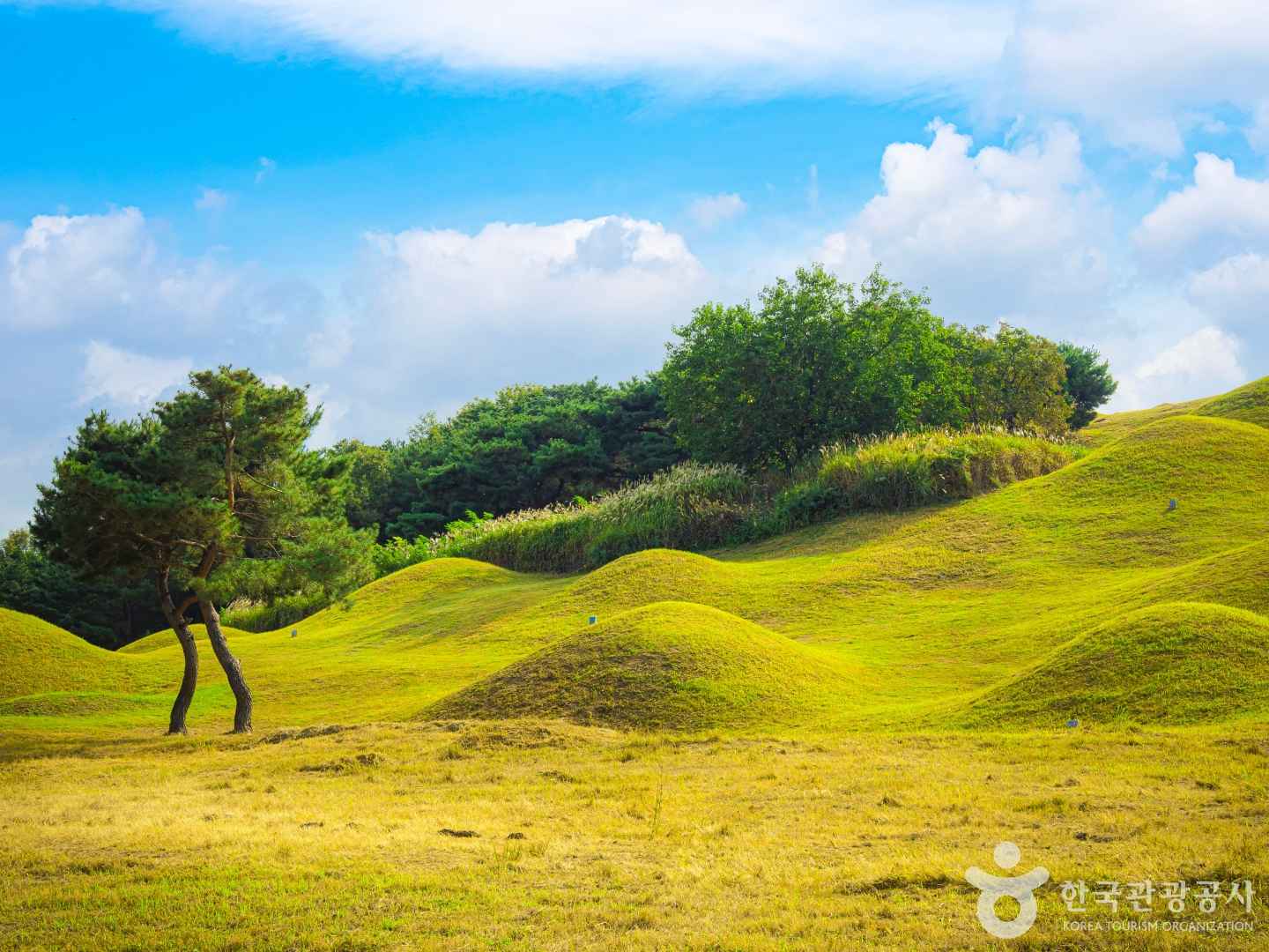 고분군 전경을 가장 잘 담을 수 있는 곳은 조금 높은 언덕 위에서 내려다보는 방향이에요. 초록 잔디와 둥그런 고분의 조화는 자연이 만든 조형미 그 자체랍니다.