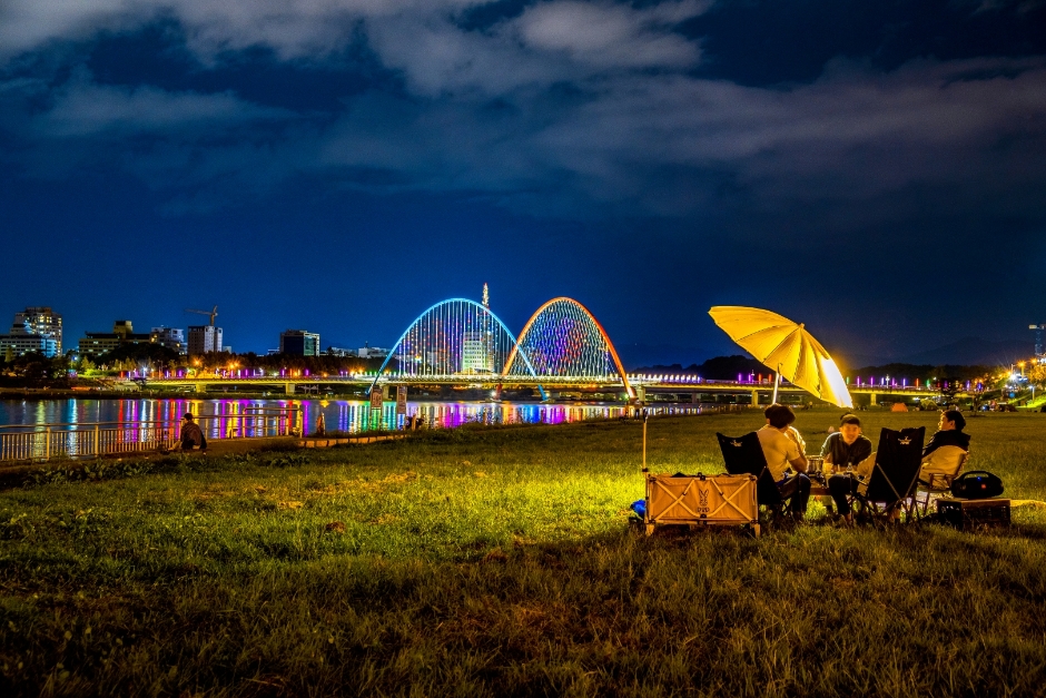 낮의 평화로움도 좋지만, 엑스포다리의 진가는 밤에 드러나요! 일몰부터 밤 11시까지 점등되는 다채로운 조명은 갑천을 감싸는 다리 전체를 하나의 작품처럼 만들어줘요.