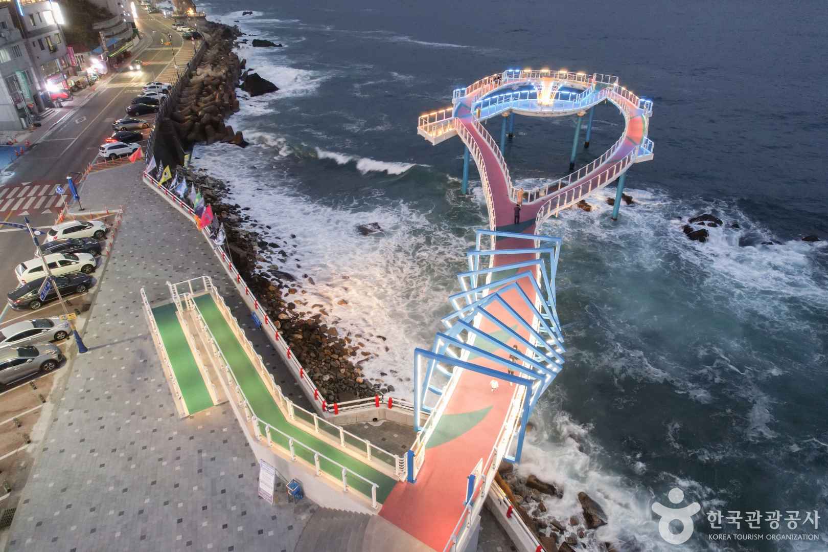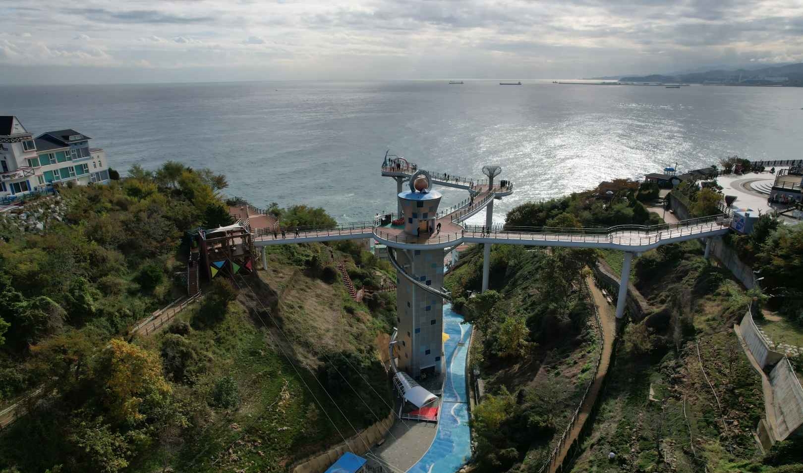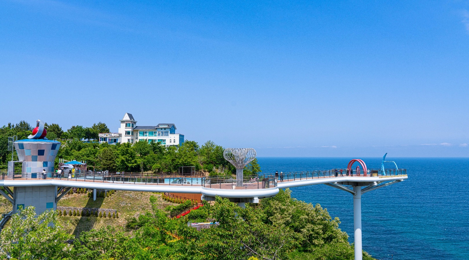양쪽 구조물을 잇는 와이어 케이블을 따라 하늘 위를 자전거로 달리는 체험! 높이감과 흔들림으로 인해 심장이 쫄깃하지만, 페달을 밟는 그 순간 동해의 푸른 풍경이 한눈에 펼쳐지는 특별한 경험을 하게 됩니다.