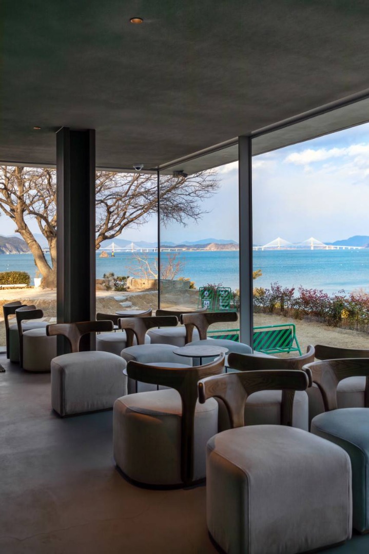 매미성을 둘러봤다면, 도보로 몇 분 거리에 있는 카페 ‘매미 캐슬’도 꼭 들러보세요! 곡선의 독특한 건물 외관과, 거가대교와 바다를 한눈에 담을 수 있는 파노라마 뷰가 일품이에요.