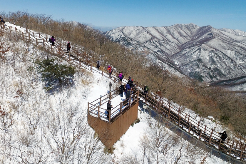 겨울이 되면 천황산은 억새 대신 순백의 눈으로 뒤덮인 능선을 자랑해요. 푸른 하늘 아래 선명하게 드러나는 산세는 감탄을 자아내며, 눈이 덮인 부드러운 능선과 거친 암봉이 극적인 조화를 이룹니다. 사자봉 정상에서 내려다보는 설산 능선, 그 아래로 흐릿하게 펼쳐지는 산 그림자와 마을 풍경은 마치 수묵화처럼 깊고 여운 있는 겨울 풍경을 선사하죠. 눈이 쌓인 능선을 따라 걷는 느낌은 마치 자연과 하나 되어 걷는 것처럼 경이롭습니다. 조용한 겨울 산의 매력을 제대로 느끼고 싶다면, 천황산이 정답이에요!