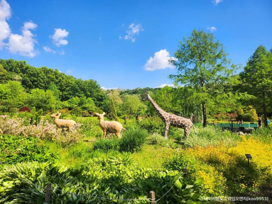 무릉도원수목원은 단순한 녹지 공간을 넘어서 다양한 테마존으로 구성되어 있어요. 그 중에서도 아이들과 함께라면 사슴과 기린 모양의 토피어리원을 꼭 들러보세요! 생동감 있는 동물 조형물과 꽃이 어우러져 정말 귀엽고 인상적이에요.