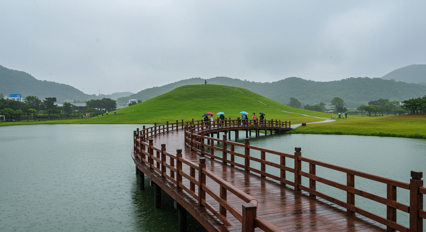 순천만 국가정원은 비 오는 날 더욱 평화로운 분위기를 선사하는 자연 명소예요. 빗방울이 떨어지는 연못과 촉촉한 정원 풍경은 마치 동화 속 한 장면 같답니다.
