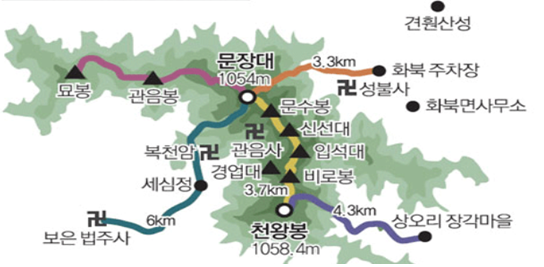 문장대에 오르는 길은 여러 갈래가 있지만, 그중 가장 많이 이용되는 코스는 화북탐방지원센터에서 출발하는 코스입니다.