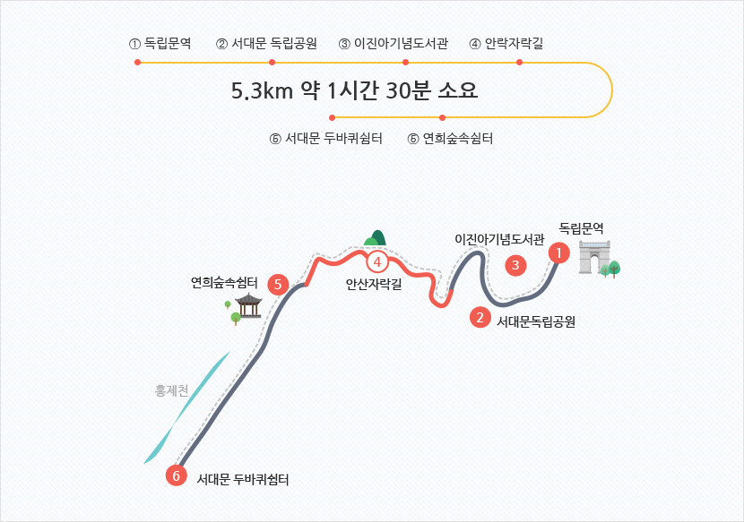 | 코스3 | 독립공원 → 홍제천 | 역사 체험과 하천 산책의 활력 |