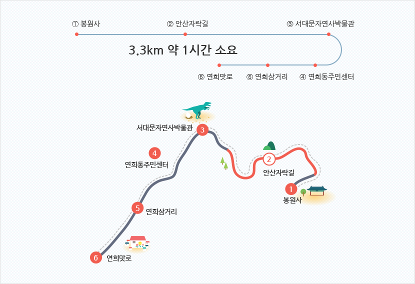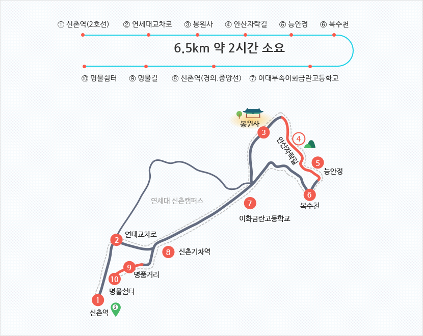 | 코스1 | 신촌역 → 봉원사 | 젊은 신촌의 분위기와 전통 사찰의 조화 |