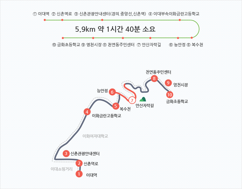 | 코스2 | 이대역 → 영천시장 | 쇼핑과 시장 먹거리, 여유로운 산책 |