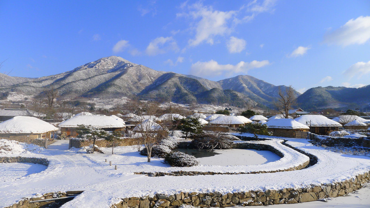 하얗게 눈이 덮인 초가집과 돌담길, 기와지붕의 풍경은 마치 한 폭의 동양화를 연상케 하죠.