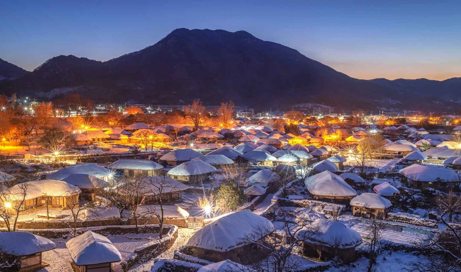 하얗게 눈이 덮인 초가집과 돌담길, 기와지붕의 풍경은 마치 한 폭의 동양화를 연상케 하죠.