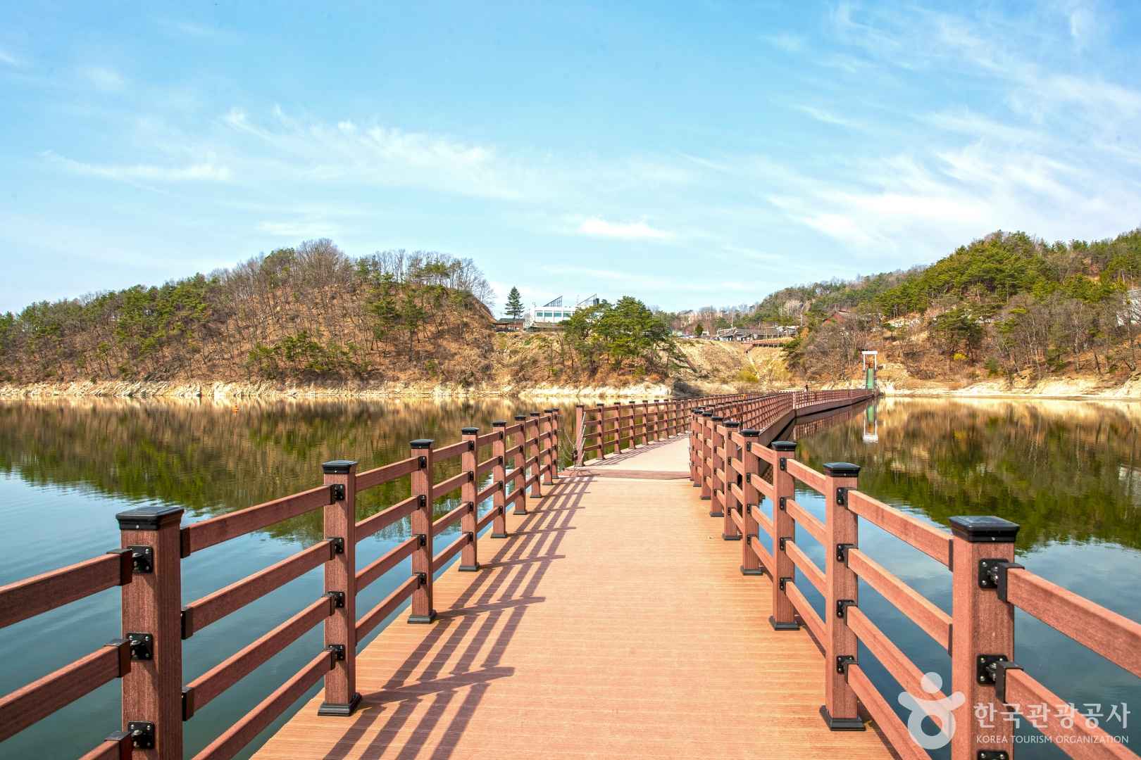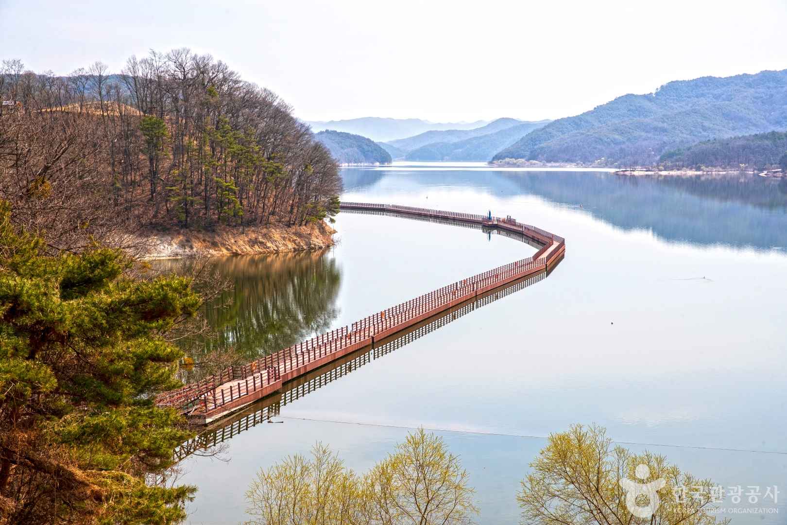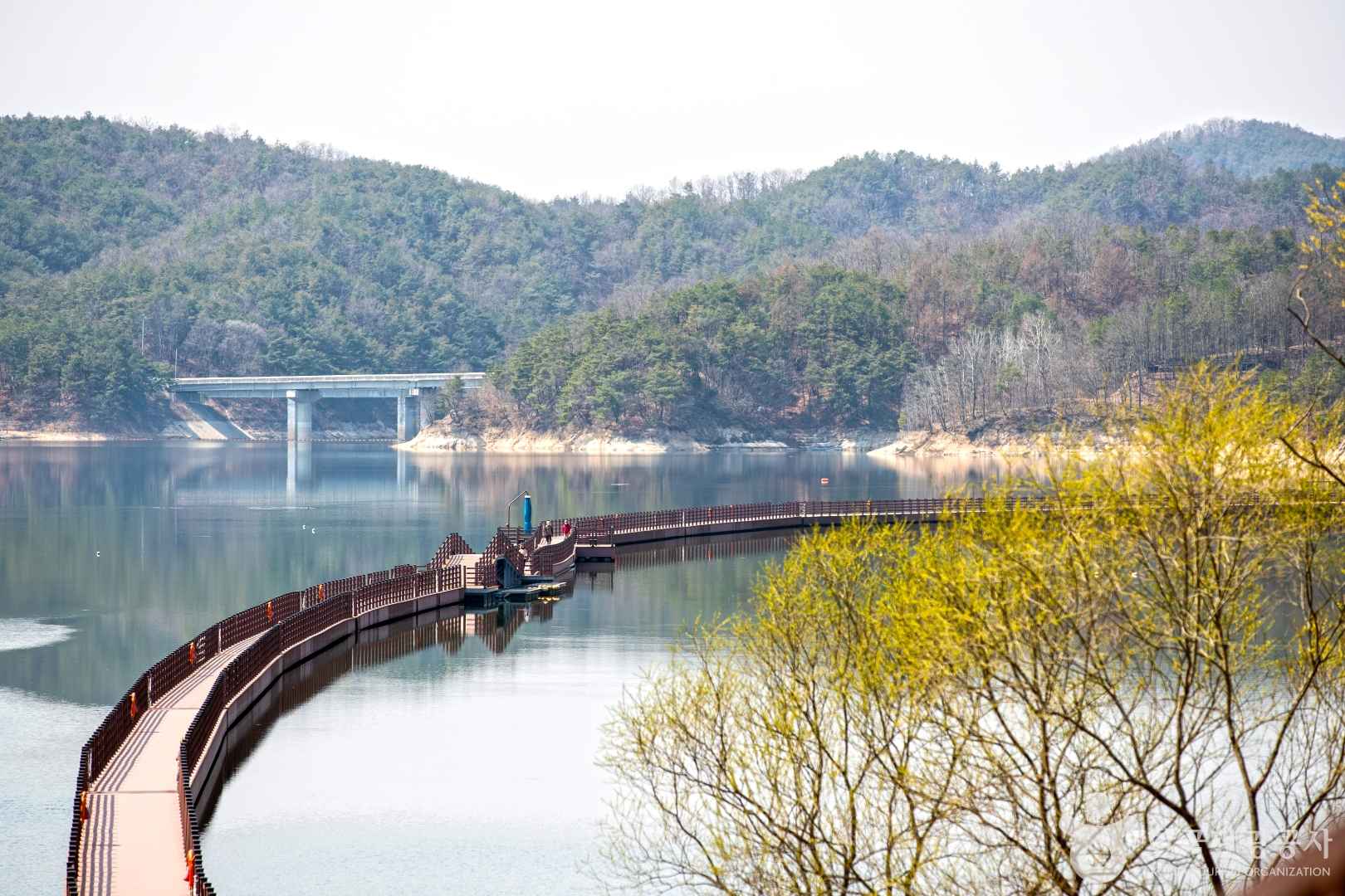 선성수상길은 단순한 산책로가 아닌, 물 위에 떠 있는 부교로 구성되어 있어요. 길이 약 1km, 폭 2.75m의 데크가 부드럽게 굽이치며 호수를 따라 이어지는 이 길은 일몰이나 아침 안개 속 풍경과 어우러질 때 마치 한 폭의 수채화를 걷는 듯한 느낌을 줍니다. 특히 바닥에 물결처럼 퍼지는 햇살과, 데크 위에 설치된 감성적인 벤치와 쉼터는 걷는 즐거움 외에도 ‘멈춤’의 미학을 느끼게 해줘요.