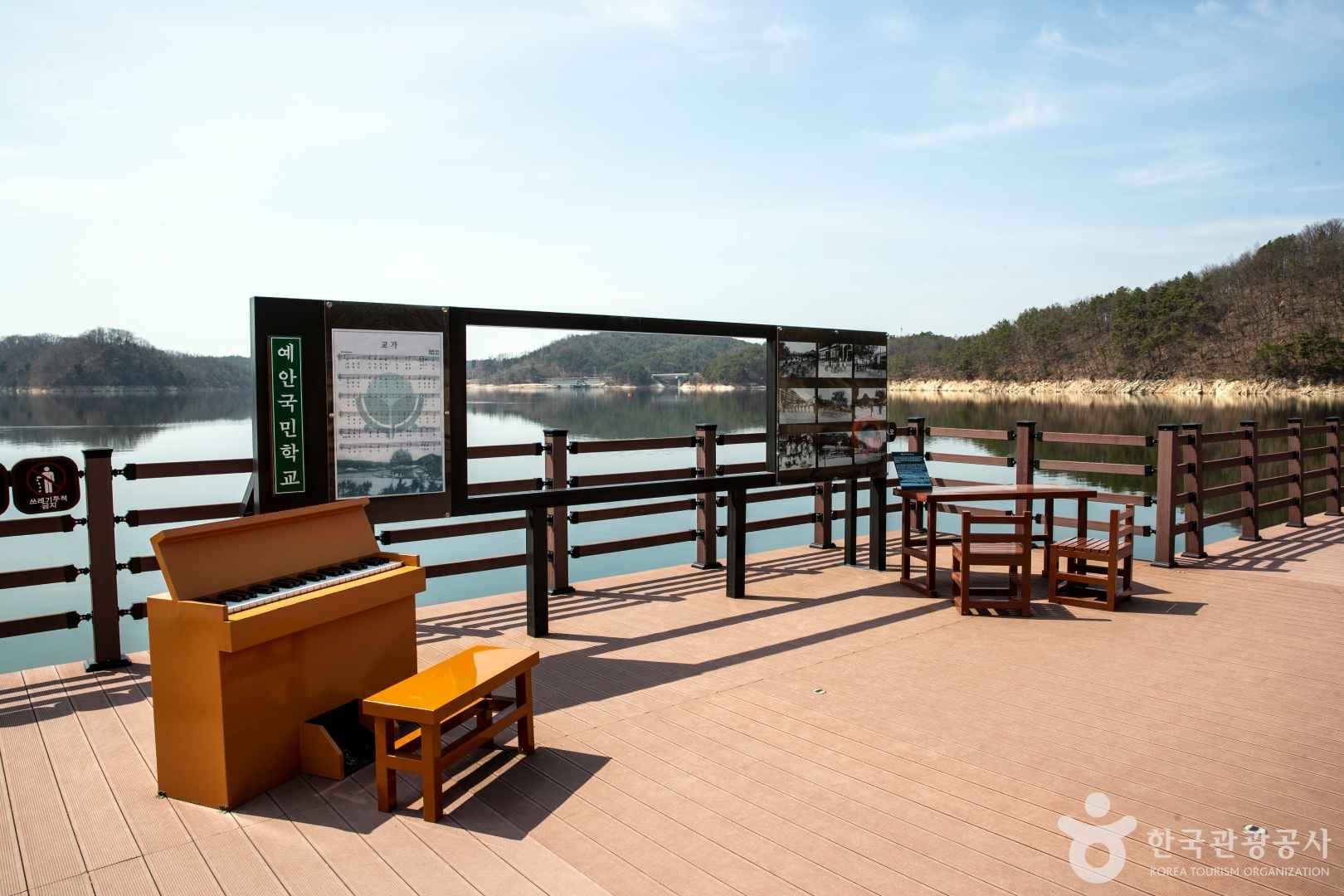 선성수상길을 걷다 보면 중간 지점쯤, 풍금, 옛 책걸상, 흑백사진 등이 전시된 작은 공간을 마주하게 되는데요. 이곳은 1974년 안동댐 건설로 수몰된 예안국민학교의 터를 기념하는 공간입니다. 실제로 이곳은 예안초등학교가 있었던 자리로, 물이 잠식한 마을의 역사와 추억을 상징적으로 보여주는 곳이에요. 사라진 교실의 흔적을 통해, 자연과 인간의 시간이 만들어낸 이야기를 조용히 되새길 수 있는 순간이 되어줄 거예요.