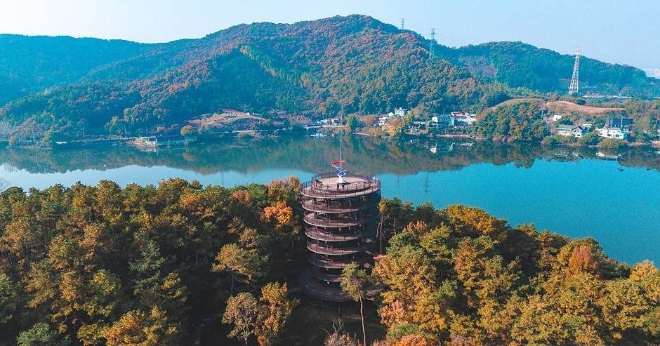 이 전망대는 단순히 높은 곳이 아닌, 예술적인 구조물로도 주목을 받고 있어요. 전통 문화유산인 ‘남사당 바우덕이’의 상모놀이와 접시돌리기에서 영감을 받아 곡선이 살아 있는 나선형 구조로 디자인되었으며, 외형 자체만으로도 볼거리가 됩니다. 전망대 정상에 도달하면, 상모의 회전을 형상화한 조형물이 기다리고 있어요. 그리고 무엇보다 놓치지 말아야 할 것은 바로 탁 트인 호수 전경! 가을철에는 단풍이 겹겹이 수면에 비쳐, 깊고 고요한 운치를 선사합니다. 사진 찍기에 완벽한 명소이자, 계절의 변화를 온몸으로 느낄 수 있는 포인트이기도 해요. 한 장 한 장 찍는 사진마다 그림엽서 같은 풍경이 펼쳐지니 꼭 카메라를 챙겨가세요!