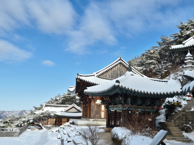 특히 겨울이면 고요한 설경이 장관을 이루는데요. 석탑과 전각 지붕 위로 수북이 쌓인 눈, 소나무 가지 사이로 비치는 햇살이 어우러져 마치 시간마저 멈춘 듯한 평온한 분위기를 선사합니다.