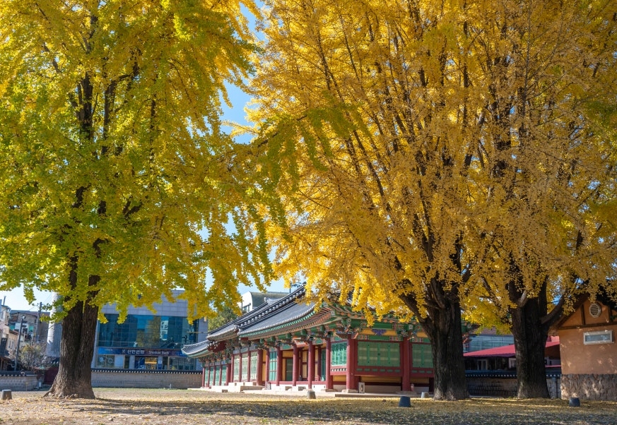 관풍헌을 감싸고 있는 은행나무는 가을이 되면 노란 물결처럼 마당 전체를 덮는 아름다운 풍경을 선사합니다. 특히 단풍이 절정인 10월 말~11월 초쯤에는 자연스럽게 그라데이션이 퍼지는 듯한 색감으로 인해 이곳을 찾는 이들의 감탄을 자아내죠. 고요한 공간, 가을 햇살, 바스락거리는 낙엽 소리… 마치 시간이 멈춘 듯한 감성을 느낄 수 있어요.