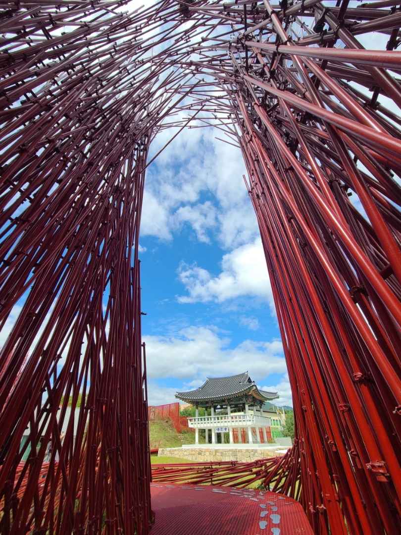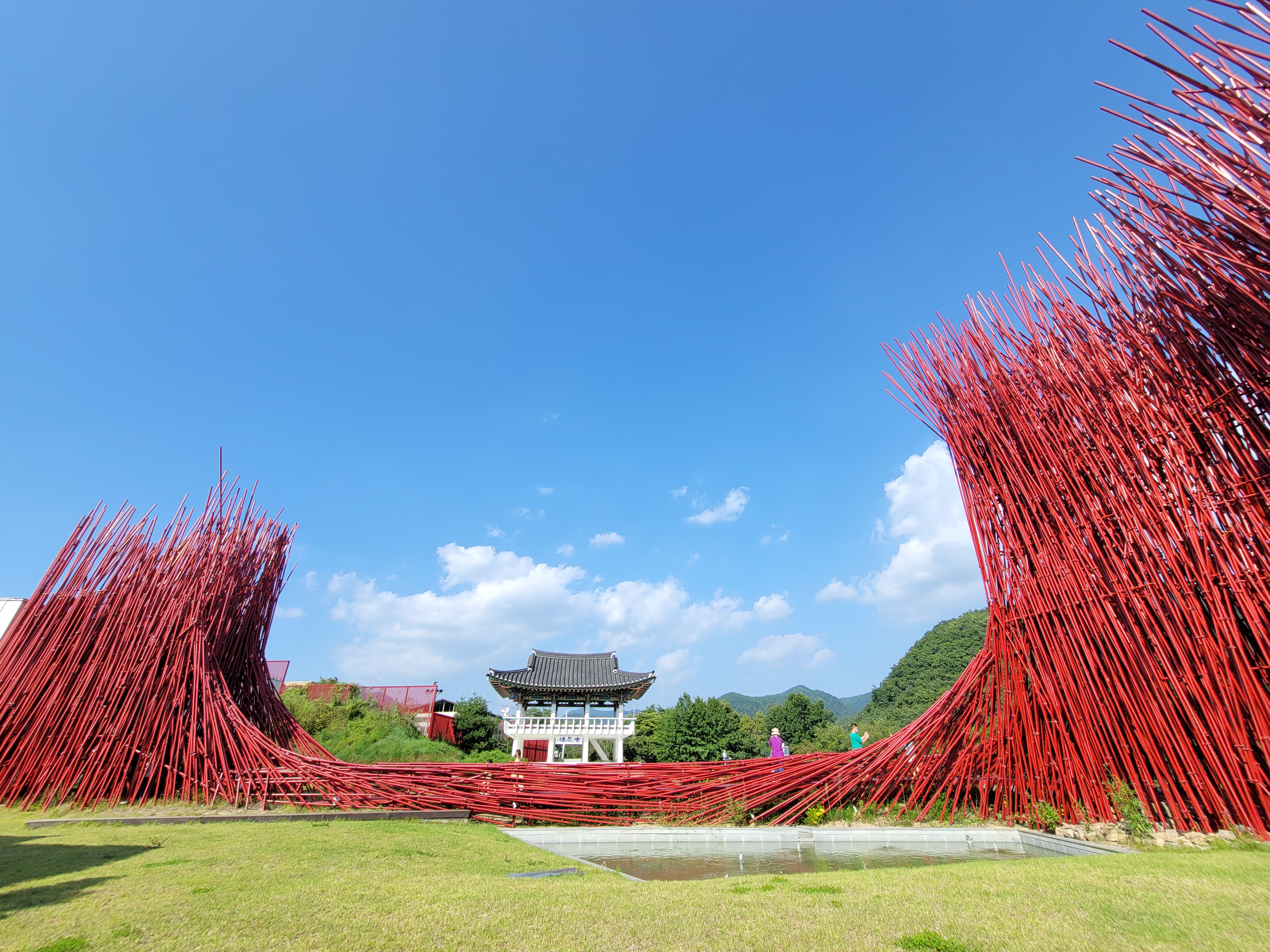 바로 젊은달 와이파크예요. 이곳은 조각가 최옥영 작가의 손길로 태어난 복합예술공간으로, 붉은 대나무와 목성, 우주적인 설치미술들이 가득한 이색 장소랍니다.