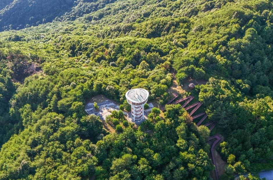 하늘자락공원의 중심, 전망대는 소백산 능선 위에 펼쳐지는 360도 파노라마 뷰가 압권이에요. 특히 전망대는 은하수가 흘러내리는 나선형 디자인으로 설계되어 한 걸음 한 걸음 오를 때마다 자연과 예술을 동시에 느낄 수 있어요.