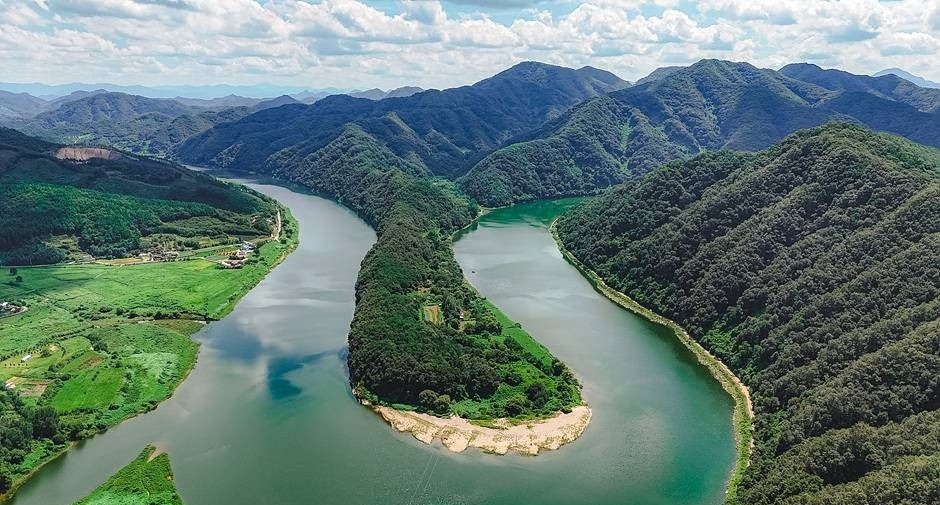 충북 옥천군 안남면에 위치한 둔주봉은 옥천 제1경이라 불릴 만큼 빼어난 자연 절경을 자랑하는 명소예요. 특히 ‘한반도 지형’이라는 독특한 형태를 가진 지형이 가장 큰 볼거리인데요. 이 모습은 굽이치는 금강 줄기가 만든 자연의 예술작품으로, 길이 1.45km로 실제 한반도를 1/980로 축소한 모양이에요.