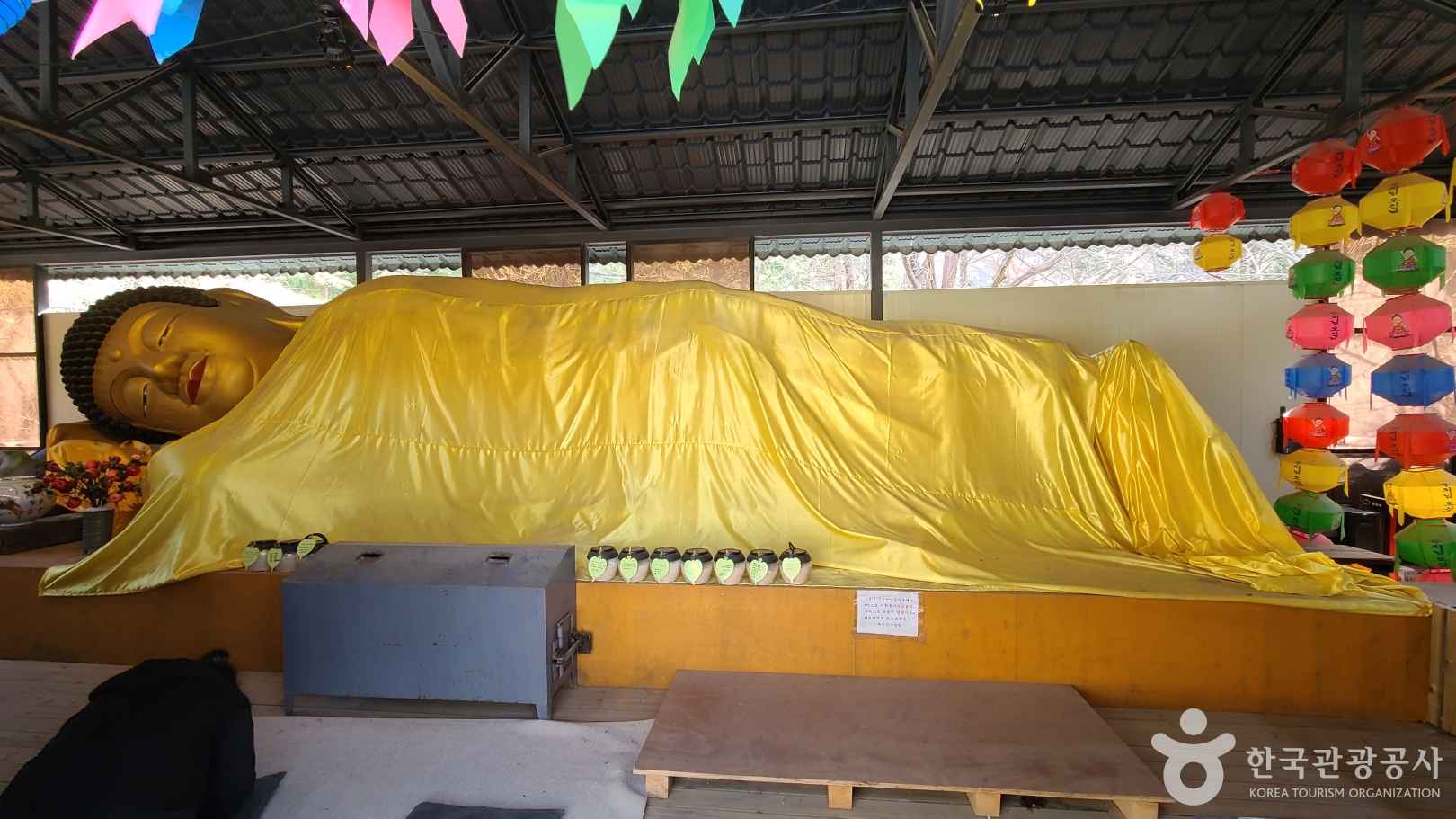 와우정사의 상징 중 하나는 길이 12m, 높이 3m의 거대한 와불(臥佛)입니다. 인도네시아산 향나무로 제작되었으며, 누워 있는 부처님의 자비로운 표정이 보는 이의 마음을 편안하게 만들어줘요.