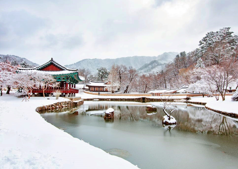 사람 없는 고요한 시간대, 연못 위에 피는 아침 안개와 설경의 조화는 그야말로 숨은 포토 스팟이에요!
