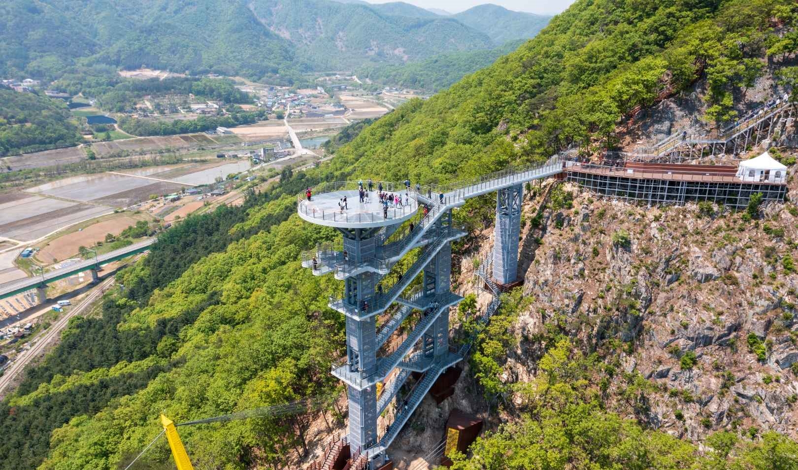 절벽을 따라 올라간 끝에서 마주하게 되는 스카이타워, 이곳은 소금산 그랜드밸리 트레킹 중 가장 넓은 시야를 자랑하는 전망대입니다.