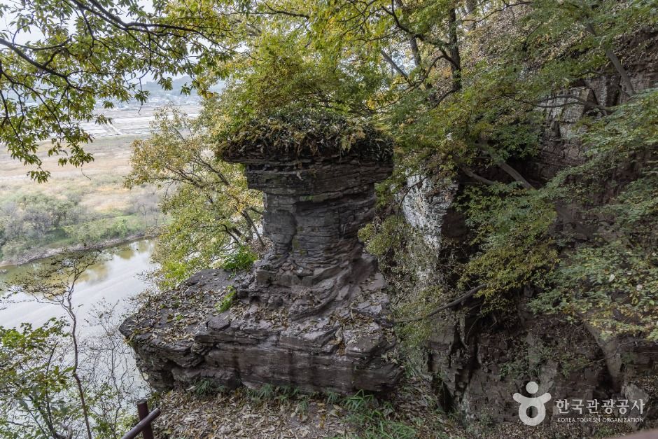 - 층층이 쌓인 바위 형상 - 꼭대기에 올라선 작은 바위가 탑의 꼭짓점처럼 보이며, 독특한 비율이 시선을 사로잡아요.