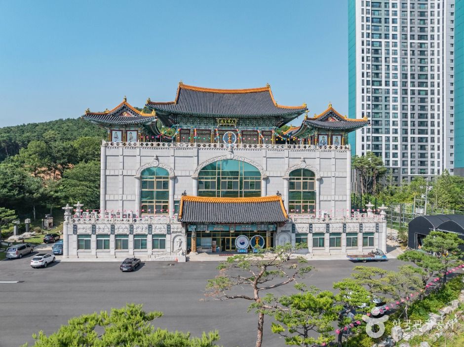 황룡사에서 가장 먼저 눈길을 끄는 건 마치 유럽의 성당 같기도 한 대불보전이에요. 외관은 유럽풍 건축미를 담았지만, 그 안에는 불교의 상징과 한국 전통 사찰의 디테일이 녹아 있어요. 기와지붕, 부조 조각, 불상 장식까지 오묘하게 어우러진 모습은 국내 어디서도 보기 힘든 이색적인 풍경을 선사하죠.