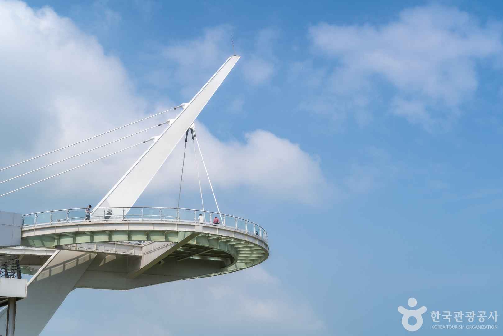 화개정원의 백미는 단연 화개산 전망대입니다. 이 전망대는 전국 최대 규모의 스카이워크형으로 설계되어 있으며, 강화군의 군조인 저어새를 형상화한 독특하고 상징적인 디자인이 특징입니다.
