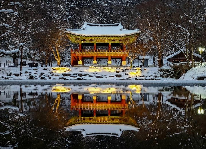- 쌍계루 → 연못 뷰: 눈 덮인 쌍계루가 연못에 반영되면, 그 자체로 작품 같은 풍경이에요.