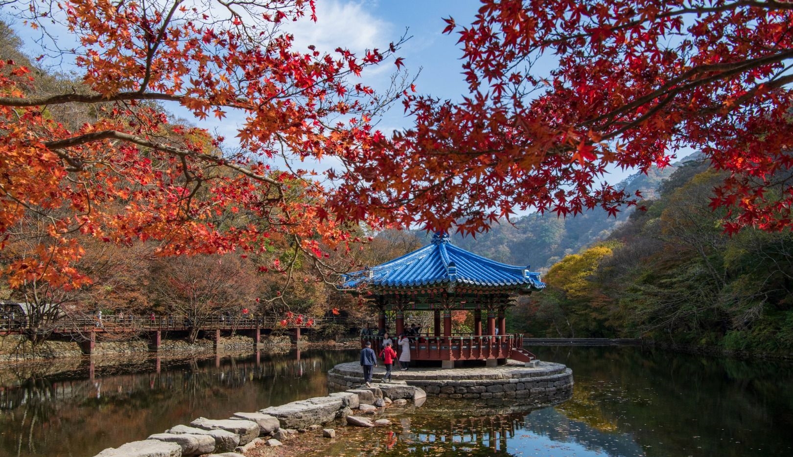 가을의 우화정은 마치 한 폭의 수채화 같아요. 맑고 고요한 연못 수면 위로 붉은 단풍이 비쳐 환상적인 반영을 만들어내죠. 사진을 찍는 순간마다 엽서처럼 나오는 풍경, 잊지 못할 가을의 한 페이지가 되어줍니다. 연못 위에 앉은 듯한 우화정과 그를 감싸는 나무들, 잔잔한 물결, 그리고 연못을 가로지르는 징검다리까지… 어느 곳을 바라보아도 감성 가득한 가을의 그림이에요.
