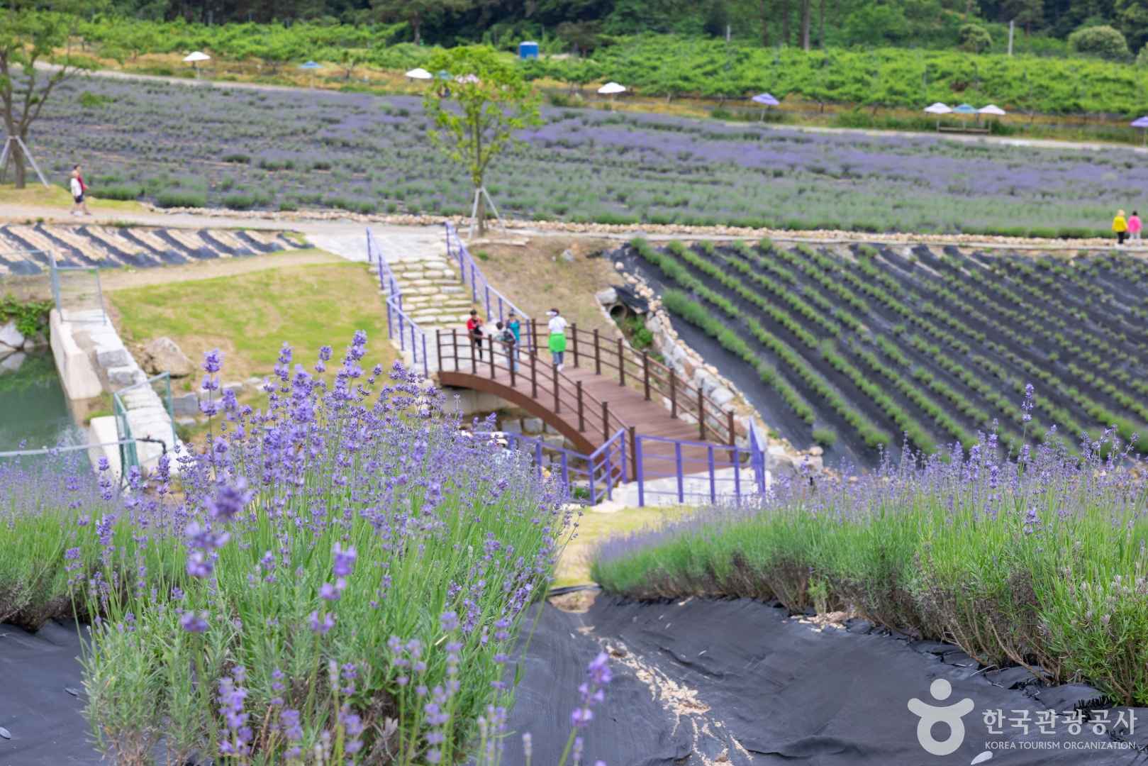 라벤더밭 사이로 이어지는 곡선형 산책로는 마치 프랑스 남부 프로방스를 연상케 하는 장면이에요. 양옆으로 끝없이 펼쳐진 보랏빛 라인 위에서, 걷는 순간 자체가 이미 화보입니다.