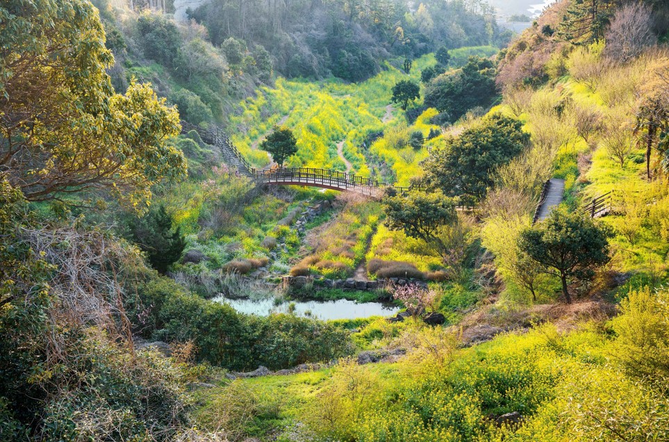 특히 위쪽에서 내려다보는 구도가 인상적인데요. 계곡 경사면과 유채꽃, 연못이 한 프레임에 담기며 일반 유채꽃밭에서는 보기 힘든 입체적인 장면을 완성합니다.